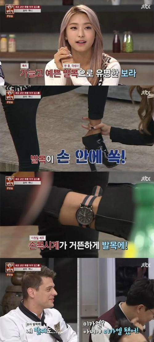 이에 ‘냉장고를 부탁해’ MC 김성주는 보라의 발목에 이원일 셰프의 손목시계를 채워보기로 했다. 이 모습에 오세득 셰프는 “사슴 뒷다리도 아닌데”라며 웃음을 자아냈다.