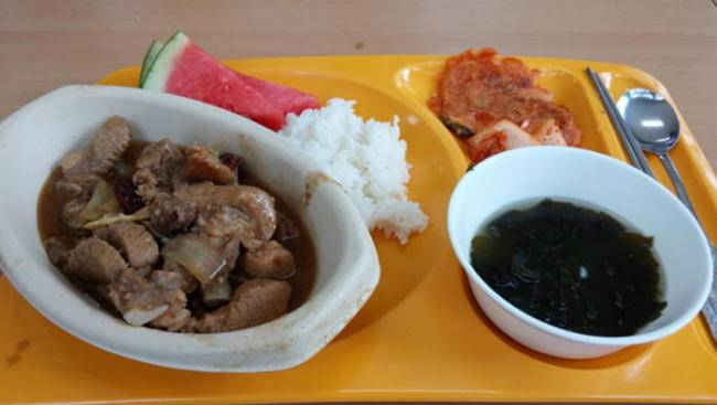 해당 글에는 양식과 한식으로 나눠져 있는 급식 메뉴와 생일인 사람들에게 제공되는 ‘통닭 한 마리’ 생일상, 1년에 두 번 열리는 삼겹살 파티 현장 사진이 붙어 있다.