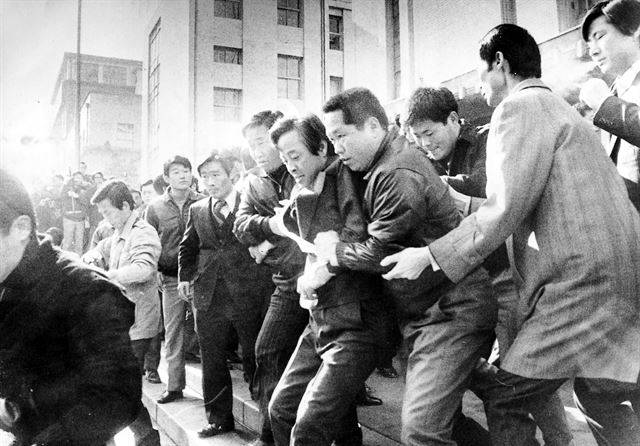 1974년 11월 16일 김영삼 총재를 선두로 스크럼을 짜고 시위에 나서려는 신민당 의원들이 국회 정문 앞에서 여당의원들의 제지를 받고 있다.