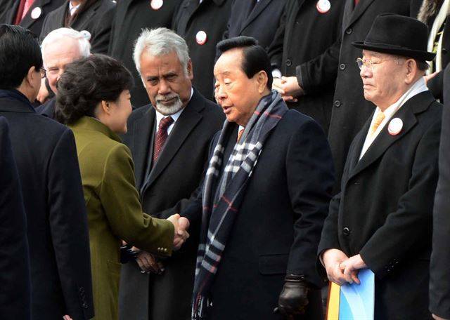 2013년 2월 25일 박근혜 18대 대통령이 국회에서 열린 취임식에 참석한 김영삼 전 대통령과 악수를 하고 있다.
