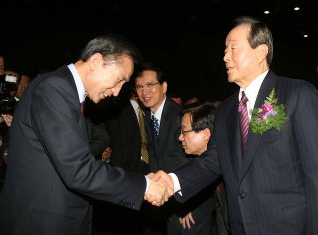 2007년 3월 13일 이명박 전 서울시장이 일산 킨텍스에서 출판기념회 행사에서 김영삼 전 대통령과 인사하고 있다.