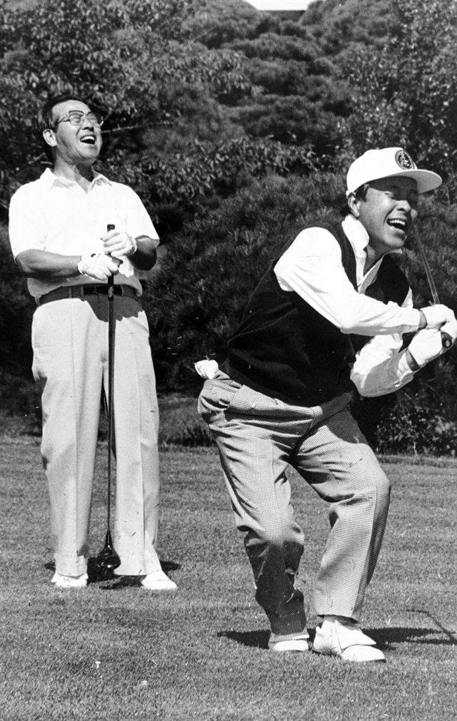 1989년 10월 2일 안양골프장 10번 홀에서 김영삼민주당총재가 티샷을 하면서 몸의 중심을 잃고 쓰러지려하자 당사자인 김민주총재는 물론 타순을 기다리던 김종필공화총재까지 파안하고 있다.