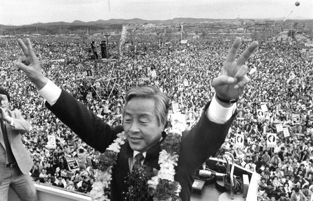 31일 하오 열린 인천대회에서 김영삼 민주당 총재가 열광하는 청중에게 승리의 브이자를 그리며 답례하고 있다.