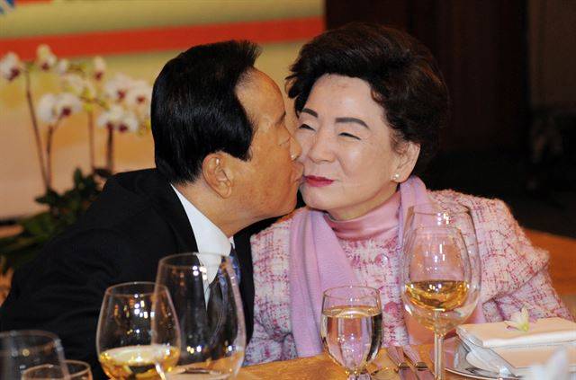 2012년 3월 4일 김영삼 전 대통령 내외의 결혼 60주년기념 행사가 열린 서울 롯데호텔 행사장에서 부부가 입맞춤을 하고 있다.