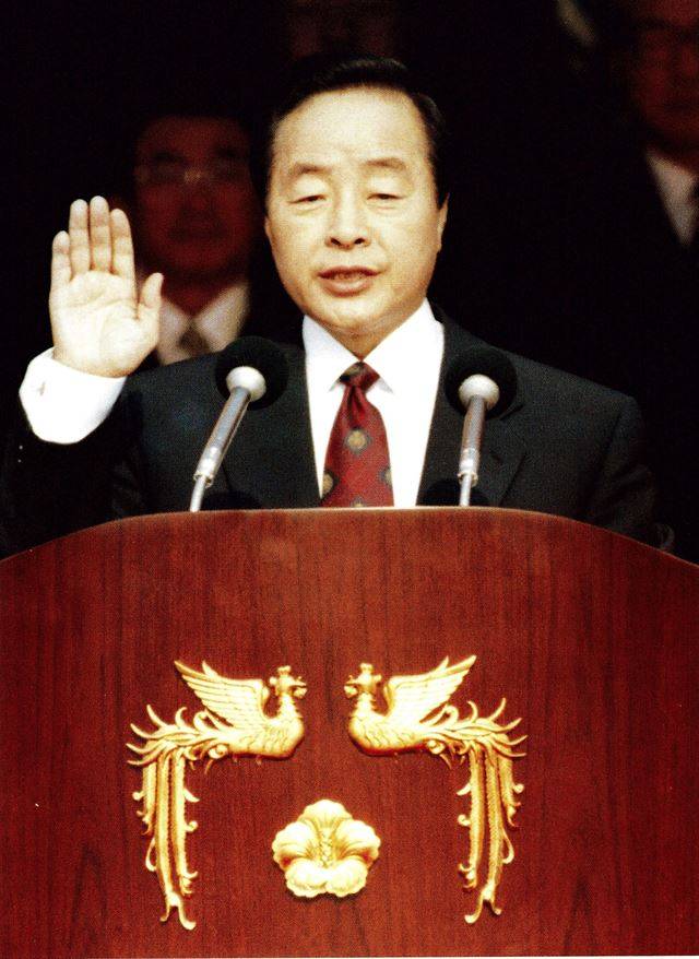 그림 29 김영삼(金泳三) 대통령이 1993년 2월 25일 여의도 국회의사당 광장에서 각계 인사 3만영 명이 참석한 가운데 열린 제14대 대통령 취임식에서 오른손을 들고 대통령직을 성실히 수행할 것을 국민 앞에 선서하고 있다.