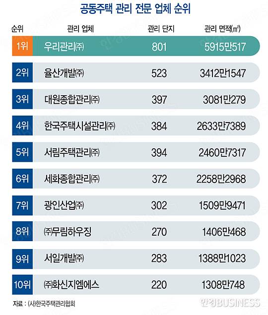 (사)한국주택관리협회에서 집계한 ‘공동주택 관리 현황(2015년 7월 기준)’에 따르면 가장 넓은 면적의 공동주택을 관리하고 있는 관리 업체는 우리관리(관리 면적 5915만517㎡, 관리 단지 801개)인 것으로 나타났다. 이어 율산개발(3412만1547㎡, 523개)과 대원종합관리(3081만279㎡, 397개), 한국주택시설관리(2633만7389㎡, 384개) 등이 그 뒤를 이었다.
