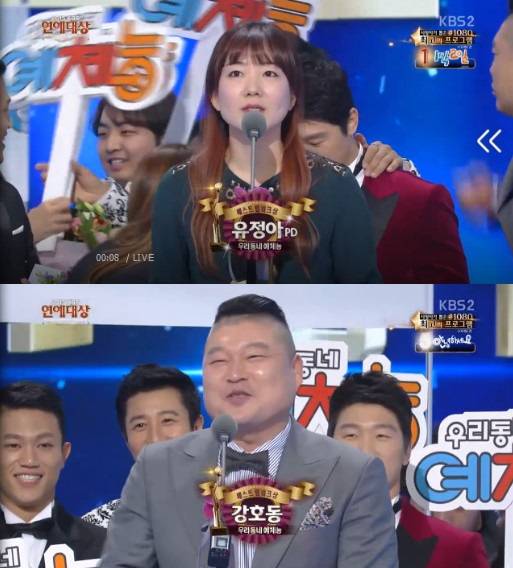 유정아 PD는 "'우리동네 예체능'은 생활체육의 즐거움과 건강한 땀의 의미를 전하는 프로그램이다. 우리 멤버들 역량이 중요한 프로그램이다. 멤버들이 개인 시간 쪼개가면서 연습하고 있다. 누구보다도 가장 팀워크가 물이 올라 있는 유도 멤버들과 이 영광 함께 하고 싶다. 작가님들도 고맙다. 지금도 편집 중인 후배들에게도 감사의 말을 드리고 싶다. 우리 맏형 강호동 씨에게도 깊은 감사 드린다."