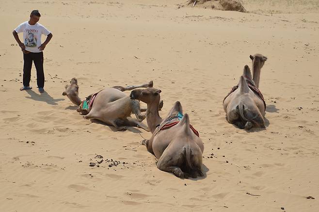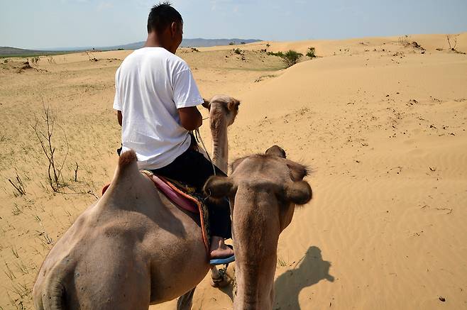 우리는 사막의 뜨거운 열기를 피해 다시 낙타 주인의 게르로 돌아가는 귀로에 올랐다. 사막으로 처음 나서는 길에서는 낙타 주인이 내가 탄 낙타의 고삐에 연결된 줄을 잡아끌고 있었다. 그런데 우리가 낙타 타기에 익숙해졌다고 생각한 낙타 주인이 낙타의 고삐 줄을 우리에게 넘겨주는 것이다. 순간, 편안히 낙타를 타면서 사막을 유람하던 우리의 마음이 복잡해졌다. 내가 직접 낙타 한 마리를 통제하게 된 것이다.