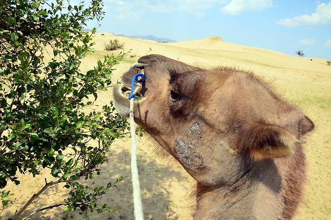 듬성듬성 자란 나무를 보자 내가 탄 낙타의 발걸음이 빨라졌다. 낙타는 잎 푸른 나무 앞으로 다가서더니 시원스럽게 나뭇잎을 뜯어먹는다. 나무들의 높이가 낙타 키 정도 돼서 낙타는 어렵지 않게 풀을 뜯어먹는다. 워낙 열심히 풀을 먹어서 풀 뜯어먹는 소리가 주변에도 들릴 정도로 크다.