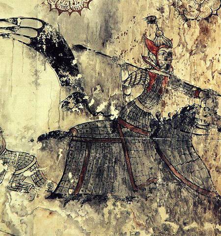 | 중국 지린 성 지안 현에서 발견된 퉁거우 12호분의 고구려 무사 벽화 모사도. 국립중앙박물관 제공 |
