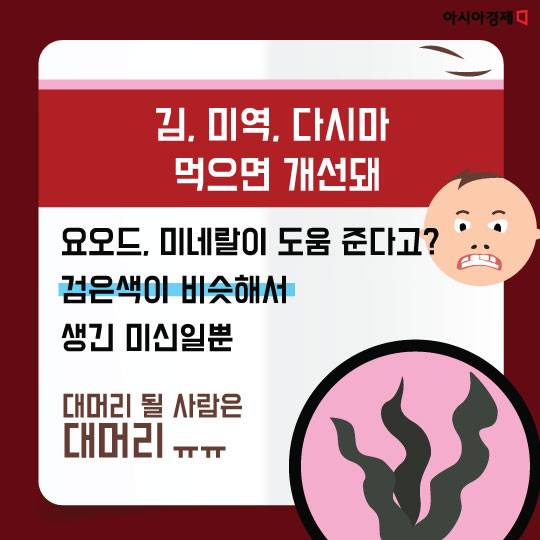 김, 미역, 다시마 먹으면 머리가 난다는 설 역시 해초의 검은색이 모발과 비슷해서 생긴 미신에 가깝답니다. 해초에 든 요오드, 미네랄이 모발 구성 성분이긴 하지만 크게 탈모 개선에 도움을 주진 못한다고 합니다.