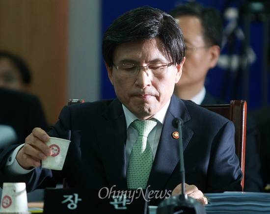 | ▲ 물 마시는 황교안 법무장관 2013년 10월 17일 법무부에서 열린 국회 법사위 국정감사에서 황교안 법무부장관이 물을 마시고 있다. |