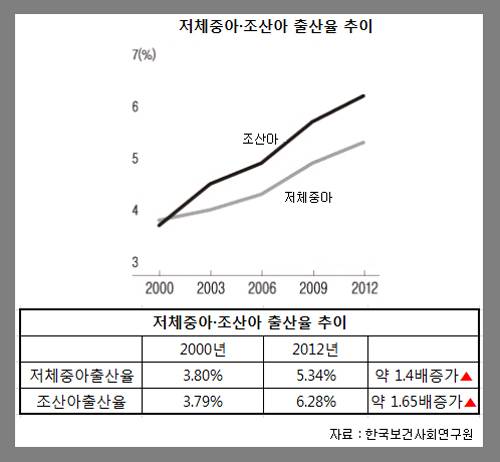 한국보건사회연구원의 '이상(異常) 출산의 동향과 정책과제'란 보고서에 따르면 저체중아 출산율은 2000년 3.80%에서 2012년 5.34%로 40.4%가, 같은 기간 조산아 출산율은 3.79%에서 6.28%로 65.6%가 늘었다.