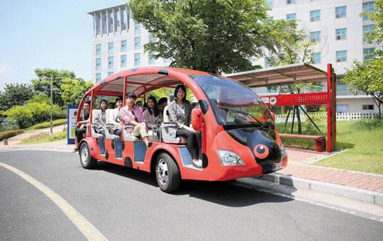 딱정벌레 버스|가천대에서 가장 인기 있는 명물은 딱정벌레처럼 생긴 에코 버스다. 17인승 전기충전식 친환경 순환버스로 학생들의 불편함을 덜어 주기 위해 이길여 총장의 아이디어로 탄생했다. 특히 높은 언덕길을 오르 내려야 하는 여학생들에게 인기다. 딱정벌레 버스는 오전 8시 40분부터 오후 5시 30분까지 하루 10분 간격으로 운행된다. 전기충전식으로 공해가 없어 친환경 캠퍼스 조성에 일조하고 있다. 하루 평균 이용 학생 수는 천여 명에 이른다.