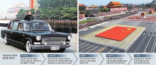 정치적으로도 각별한 의미가 있다. 역대 중국 지도자들의 천안문 열병식은 일회성 이벤트가 아니라 권력의 뿌리인 군을 포함한 모든 권력을 장악했음을 천명하는 의식이다. 마오쩌둥(毛澤東)은 1949년부터 59년까지 해마다 국경절에 천안문 광장 열병식을 거행했다. “권력은 총구에서 나온다”고 말한대로였다. 60∼70년대엔 대약진운동과 문화대혁명의 혼란으로 열병식이 중단됐다. 마오 사후 당내 투쟁을 거쳐 권력을 장악한 덩샤오핑(鄧小平)은 1984년 25년 만에 열병식을 부활시켰다. 그는 중앙군사위 주석이란 직함만으로 사열대에 섰다. 천안문에서 인민해방군을 사열하는 사람만이 진정한 중국의 권력자란 사실을 각인시켜 준 것이다.