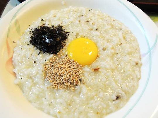 전복 내장까지 넣어서 조리한 전복죽은 푸른색을 내는데 계란 노른자와 함께 비비면 고급스러운 고소함을 느낄 수 있다. 모든 죽은 기본간이 전혀 되어있지 않아 다소 심심하게 느껴질 수 있는데 함께 제공되는 밑반찬과 같이 먹으면서 간을 맞추면 된다.