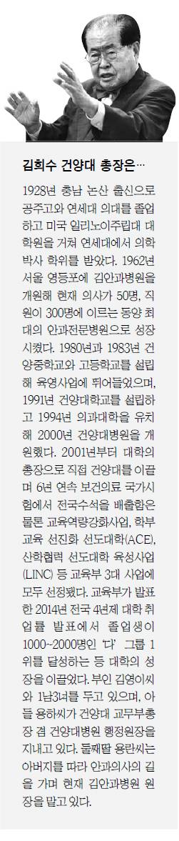 땅딸막한 체구에 나비넥타이가 어울리는 노신사. 동양최대 안과전문병원의 신화를 만들고, 남들은 은퇴할 60대에 대학을 설립하고, 90을 바라보는 나이에도 매일 새벽 네시가 되면 어김없이 병원 응급실과 병실에서부터 중환자실과 약제실은 물론 전기실과 식당까지 1시간 동안 꼼꼼이 돌아보는 근면ㆍ성실과 열정의 화신. 김희수(87) 건양대 설립자 겸 총장은, 80의 나이에 복권돼 중국의 개혁개방을 총지휘함으로써 부도옹(不倒翁)이란 별명을 들었던 덩샤오핑(鄧小平)을 연상시킨다. ‘논산의 덩샤오핑’이라고 불릴만한 그는 목표를 향해 끊임없이 노력하며 정직하게 살아온 자신의 삶이 ‘재미 없다’고 말하지만, 매우 행복해 보였다. 목표를 향해 앞으로 나아가며 크고 작은 성취를 이루는 것만큼 행복한 삶이 있을까. 나이를 잊고 젊은이다운 열정을 갖고 살아간다면 그게 행복한 삶이 아닐까. 동시에 그는 급변하는 현대사회에서 희석되기 쉬운 ‘기본이 충실한 삶’이 어떤 것인지 다시 한번 되새기게 했다. 대전 서구 건양대 메디컬캠퍼스에 있는 총장실에서 그를 만나 평생을 인술과 교육에 헌신해온 그의 삶에 대해 이야기를 나누었다.
