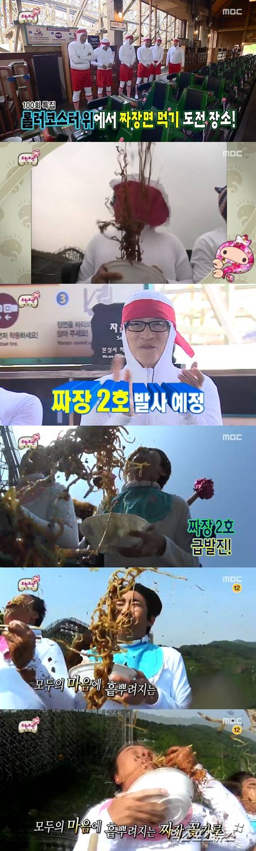 당시 정준하는 롤러코스터 위에서 짜장면 먹기에 도전했지만 상공으로 면발을 날렸다. 이어 유재석은 "'짜장 2호 발사' 하도록 하겠다"라며 정준하와 광희의 미션을 공개했다.