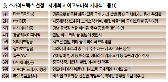 1위는 태국의 타이항공이 차지했다. 동남아 음식 강국의 국적항공사답게 타이항공 이코노믹석 기내식은 땅콩으로 버무린 매콤, 달콤한 국수와 태국식 커리, 쌀밥 등 방콕 시내 거리 음식점을 연상시키는 메뉴로 채워져 있다.