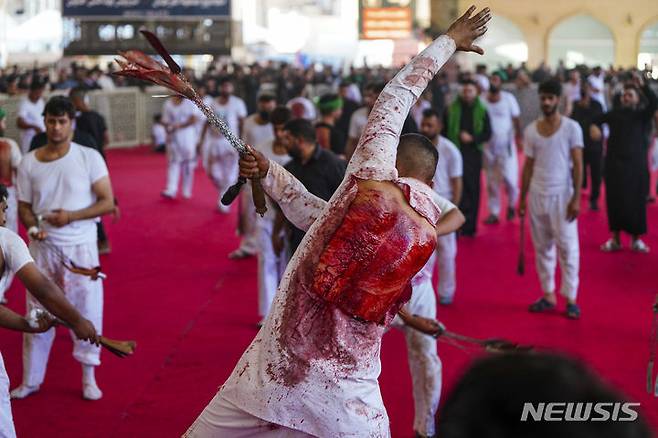 [나자프=AP/뉴시스] 14일(현지시각) 이라크 나자프에서 시아파 무슬림들이 아슈라 성일을 앞두고 자해하며 속죄 의식을 하고 있다. 시아파 무슬림들은 7세기에 수니파에 항거하다가 순교한 이맘 후세인을 애도하며 아슈라 기간에 쇠사슬이나 칼로 자해하면서 속죄 의식을 행한다. 2024.07.15.
