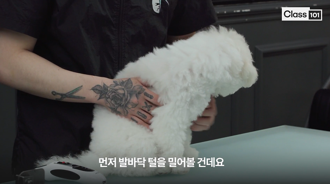 기본 미용도구 사용 방법을 익혔다면 셀프미용을 시작해볼까요? 이번에는 클리퍼로 강아지의 발바닥 털을 다듬는 방법을 알려드리겠습니다. 이제부터 실전이기 때문에 집중해주세요. 특히 강아지가 움직이지 않도록 고정을 잘 시키는 것이 중요한데요. 강아지 셀프미용을 할 때 강아지가 자꾸 움직여서 어려움을 느끼신다면 여기를 먼저 참고해 주세요.