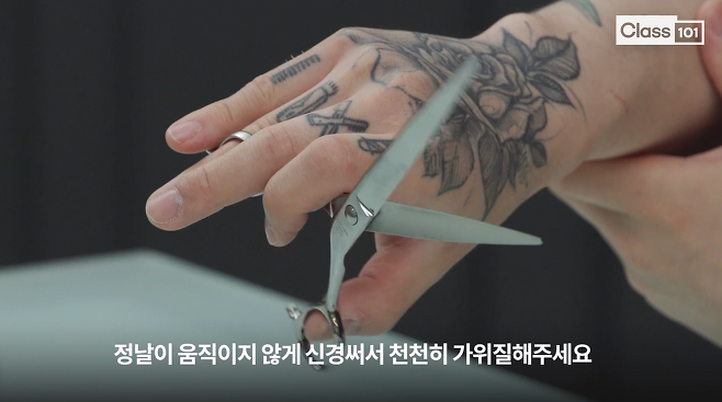 가위를 잡는 자세에 익숙해졌다면 가위질을 연습해야 합니다. 가위는 정날과 동날로 나뉩니다. 약지 손가락을 환지공에 끼운 부분이 정날이고, 엄지손가락을 모지공에 끼운 부분이 동날입니다. 정날이 움직이지 않게 엄지손가락만 움직여서 천천히 가위질하면 됩니다.
