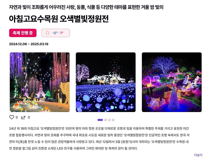 정원 곳곳에 마련된 테마별 조명 속을 천천히 거닐다가, 따뜻한 차 한 잔으로 손끝 시린 추위를 달래보세요. 별빛과 꽃빛이 어우러진 밤, 이곳에서 겨울 동화가 시작된답니다.