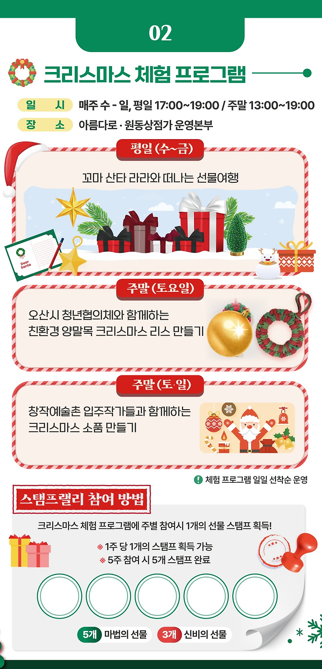 아기자기한 크리스마스 장식으로 꾸며진 오산 중앙광장에선 산타와 엘프들이 반겨주는 따스한 겨울 마켓이 열려요. 색색의 트리 불빛 아래, 핸드메이드 공예품과 지역 특산물, 귀여운 선물을 골라보는 재미가 쏠쏠하답니다. 산타와 기념 촬영을 하고, 마술쇼를 보며 아이들과 함께 동화 속 한 장면처럼 행복한 시간을 보내보세요. 김이 모락모락 나는 핫초코나 고소한 군밤 한 주먹이 곁들여지면 추위도 어느새 사라져요.