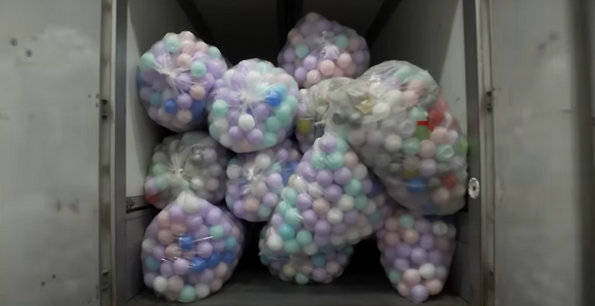 실내 공간 차이를 비교하기 위해 알아볼 방법은 지름 8CM의 키즈카페용 플라스틱 공 12,000개를 가지고 하나씩 수작업으로 실내에 몇 개가 들어갔는지 일일이 세어보면서 확인을 해보았습니다.