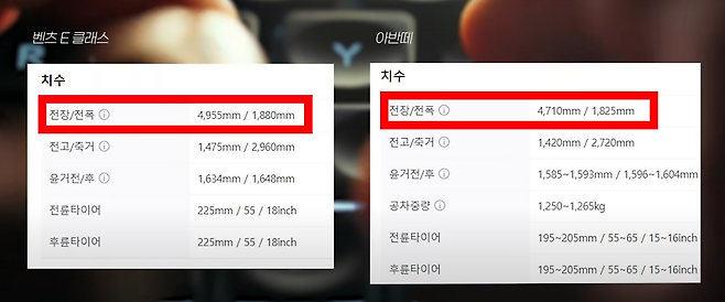 제원에서의 차이를 먼저 살펴보면 벤츠 E 클래스 전장은 4,955mm, 전폭은 1,880mm였으며 아반떼는 전장 4,710mm, 전폭 1,825mm로 E 클래스가 아반떼보다 큰 모습을 볼 수 있습니다.