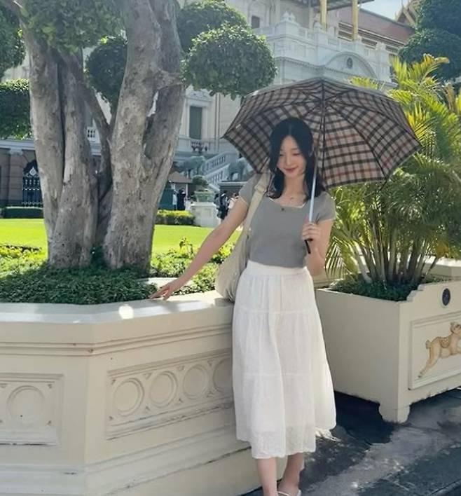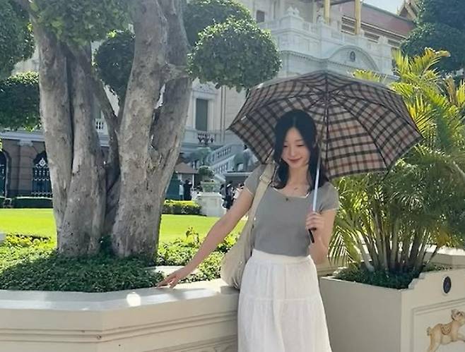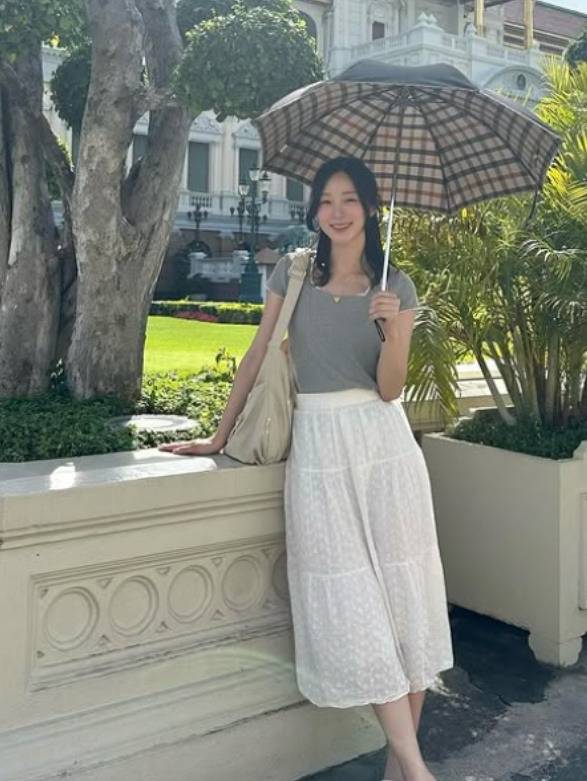 헤어스타일은 반묶음으로 연출하여 청순한 이미지를 한층 더 강조했습니다. 자연스럽게 흘러내리는 머리카락은 여성스러움을 더하고, 작은 얼굴을 더욱 돋보이게 해줍니다. 액세서리로는 체크 무늬 양산을 포인트 아이템으로 활용하여, 전체적인 룩에 생기를 불어넣었습니다. 과하지 않으면서도 센스 있는 액세서리 선택이 돋보입니다.