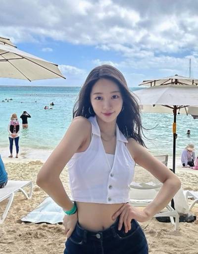 하의는 자연스럽게 퍼지는 A라인 화이트 롱스커트를 매치했습니다. 허리는 슬림하게 잡아주고 밑단으로 내려갈수록 가볍게 퍼지는 실루엣이 정예서의 가녀린 체형을 더욱 돋보이게 해줍니다. 화이트 컬러는 청순하면서도 여성스러운 분위기를 강조하며, 어떤 상의와도 잘 어울리는 활용도 높은 아이템입니다.