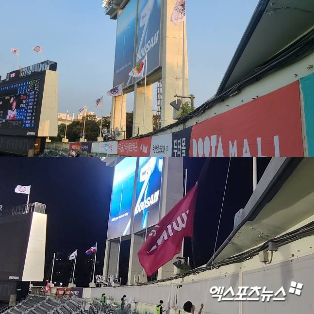 (엑스포츠뉴스 잠실, 윤승재 기자) 지난 4일, 잠실 삼성-두산전이 막 끝난 서울 잠실야구장. 조명탑의 불이 하나둘씩 꺼지며 어둠이 깔리는 사이, 관중석 이곳저곳을 뛰어다니며 분주하게 움직이는 사람들이 있었다. 형광 조끼를 입은 사람들은 내외야 관중석의 광고판을 빠르게 제거하고 구단기를 바꿔 다는 데 힘을 쏟았다. 그렇게 이들이 흐릿한 어둠 속에서 보낸 시간은 40분 남짓. 그렇게 두산의 안방이었던 잠실야구장은 어둠 속에서 LG의 홈구장으로 탈바꿈했다.