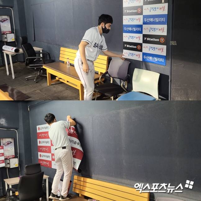 야구장 안팎으로 많은 것이 바뀐다. 야구장 메인 출입구 현수막부터 경기장 외야 높은 곳에 걸려 있는 구단기와 영구 결번 깃발, 잠실 외야에 붙어 있는 구단 광고들과 내야 출입구에 걸려있는 광고 통천 등이 동시에 철거‧교체된다. 더그아웃 배경을 장식하는 광고판이나 선수단 냉장고에 붙어 있는 스폰서 광고판도 마찬가지. 해당 작업은 잠실야구장 경호와 보안을 담당하는 업체에서 예순 명 남짓의 아르바이트생들과 함께 진행한다.