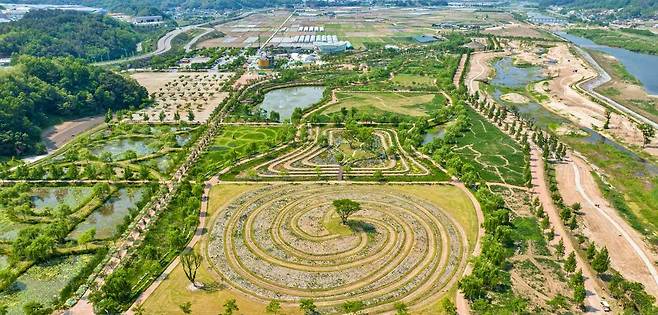 거창 창포원은 무려 42만㎡ 규모를 자랑하는 대형 수변생태공원으로 축구장 66배 크기에 달한다. 합천댐 조성으로 생긴 수몰지역을 활용해 국가하천 황강의 수질을 보호하고, 동시에 관광자원으로 개발해 지역 경제 활성화를 꾀한 공간이다. 그래서 꽃과 나무뿐만 아니라 강과 습지가 조화를 이룬 자연경관을 함께 감상할 수 있다.