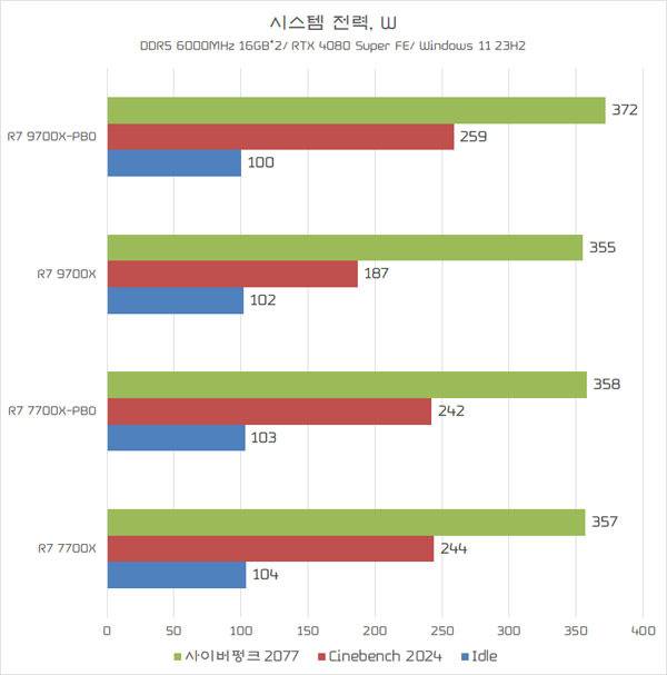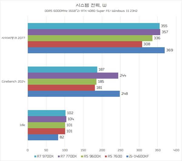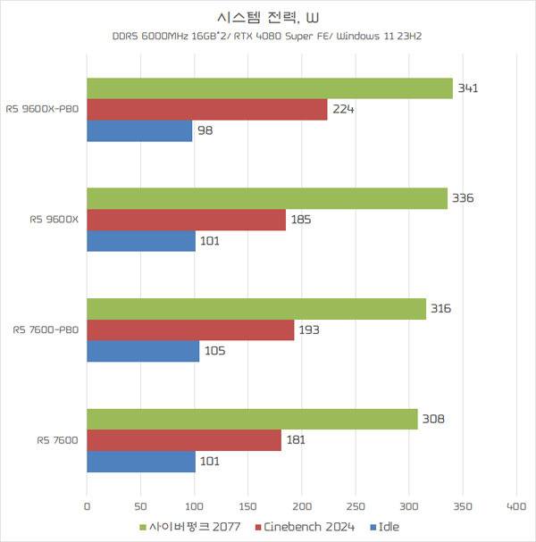 반면, CPU 이용율이 수시로 변화하는 게임(사이버펑크 2077)에서는 동일한 전력 스펙임에도 라이젠 5 9600X가 라이젠 5 7600보다 조금 더 높게 측정되었다. GPU 이용율이 더 높아진 영향 때문으로 판단된다.