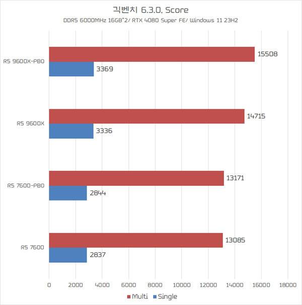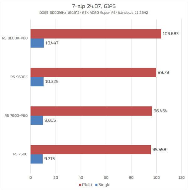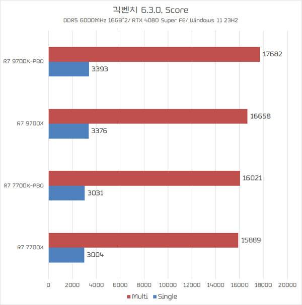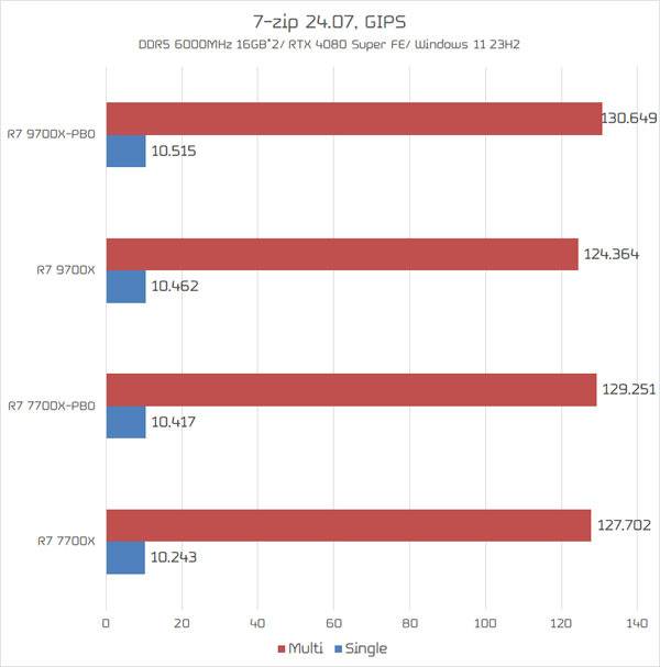 라이젠 7 9700X 멀티 스코어는 약 6GIPS, 라이젠 7 7700X는 약 2GIPS의 성능 향상을 관측할 수 있었다. 덕분에 기본 상태에서는 살짝 뒤쳐졌던 라이젠 7 9700X의 성능이 PBO 활성화시 라이젠 7 7700X를 앞지르는 결과를 보여주었다.
