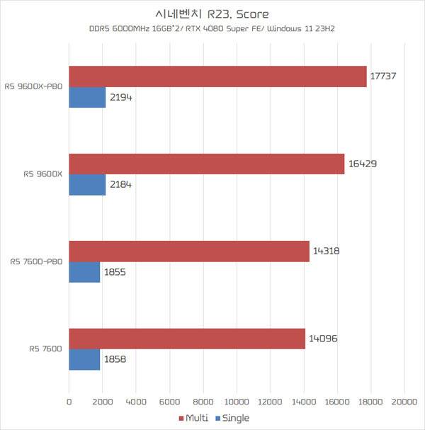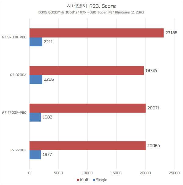 시네벤치 R23 테스트를 기준으로, 라이젠 7000 시리즈는 PBO 유무에 따른 성능 차이를 거의 기대하기 어려웠다. 반면 라이젠 9000 시리즈는 소비전력이 늘어나면서 라이젠 7 9700X의 멀티 스레드 성능이 최대 17.5% 수준까지 높아졌다.
