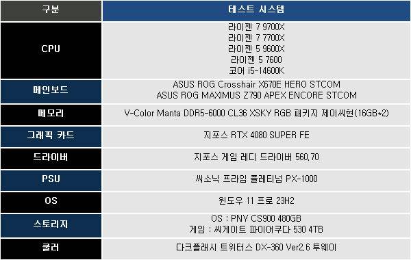 그래픽 카드는 지포스 RTX 4080 SUPER FE(게임 레디 드라이버 560.70), 메모리는 DDR5 6000MHz 16GB*2 구성에 윈도우 11 23H2 버전 환경에서 테스트를 진행했으며, 비교를 위한 인텔 코어 i5-14600K의 테스트는 ASUS TOG MAXIMUS Z790 APEX ENCORE STCOM 메인보드에서 진행했다.
