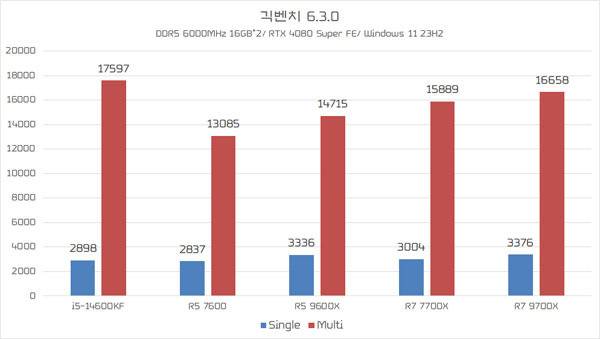 그 다음으로는 7-zip 24.07 버전과 긱벤치 6.3.0 벤치마크 결과다. 경향은 시네벤치 테스트와 거의 유사하게 나타났는데, 7-zip의 멀티 스레드 테스트 결과에서 라이젠 7 9700X의 결과가 라이젠 7700X보다 조금 낮은 점수를 보이는 것이 눈에 띈다. 이는 라이젠 7 79700X의 전력 한계치가 라이젠 7 7700X보다 낮은 것이 영향을 끼친 것으로 추정되는데, 이와 관련해서는 따로 학인해 보겠다.