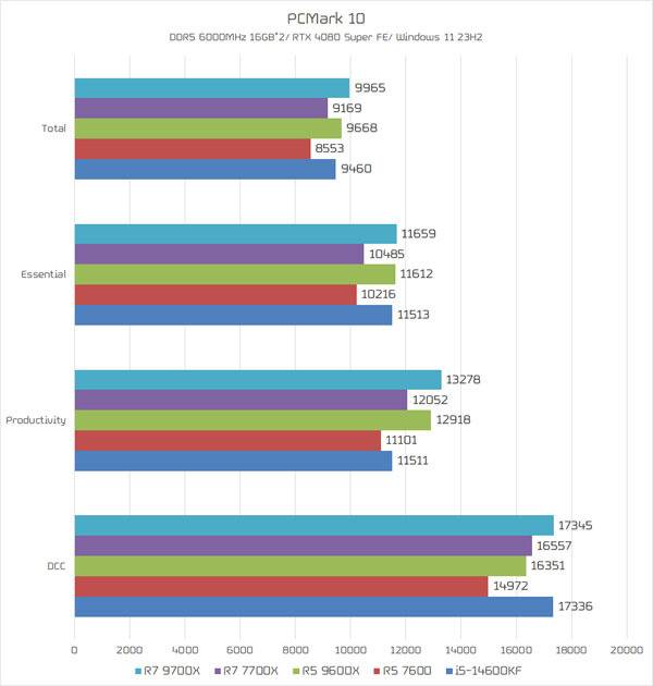 일상적인 PC 이용 성능 파악을 위한 PCMark10은 라이젠 9000 시리즈의 결과가 7000 시리즈보다 확실히 개선된 것으로 나타났다. 특히, 참고용으로 추가 테스트한 코어 i5-14600KF의 경우 6개의 P-코어와 8개의 E-코어로 가장 많은 코어로 구성되어 있지만, 코어 활용도가 높은 DCC 테스트 결과를 보면 8코어 16스레드 구성의 라이젠 7 9700X와 비슷한 수준에 머무는 것을 볼 수 있다.