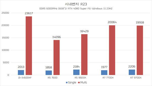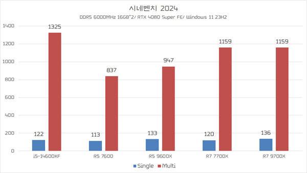 먼저 멀티 코어 성능과 싱글 코어 성능을 동시 확인 가능한 시네벤치 2024와 시네벤치 R23 결과를 정리했다. 멀티 코어 성능은 코어 i5-14600KF가 가장 뛰어난 것으로 나타났지만 싱글 코어 성능만 보면 라이젠 9000 시리즈가 더 뛰어난 것을 알 수 있다.