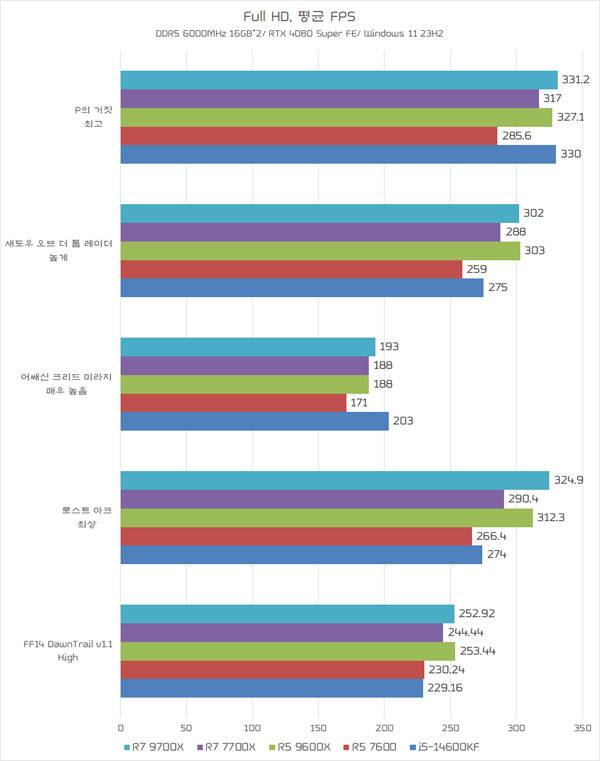 CPU별 게임 성능은 3DMark 테스트의 전체 점수와 같은 경향을 보여준다. 당연하지만 지포스 RTX 4080 SUPER FE로 동일한 그래픽 카드 기반 환경에서 CPU만 바뀐 셈이므로 당연한 결과다.