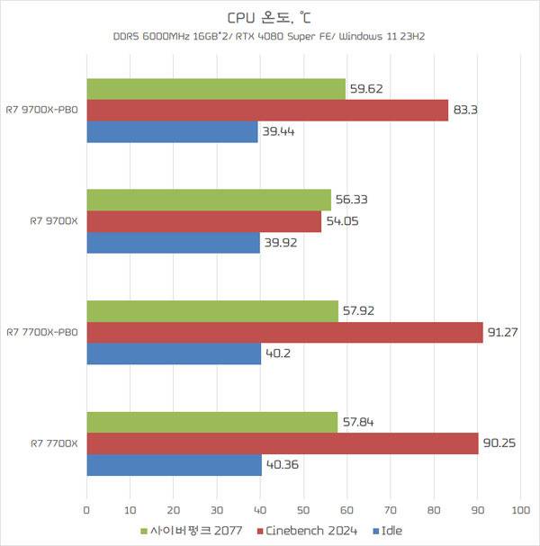 PBO 활성화시 라이젠 9 9700X의 발열과 전력 소비량이 높아지긴 했지만, 전력은 라이젠 7 7700X 대비 약 15W 높아지는데 그쳤고, 시네벤치 2024 테스트 기준 온도는 약 7℃ 낮은 상태를 유지해 여전히 뛰어난 전성비가 기대된다.
