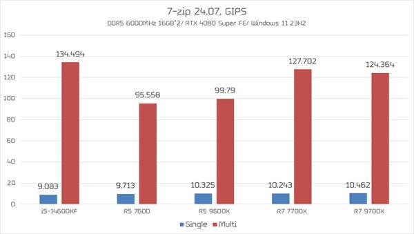 라이젠 5 시리즈 역시 라이젠 7 9600X의 성능이 약 4GIPS, 라이젠 5 7600의 성능은 약 1GIPS 상승, AMD가 발표한 라이젠 9000 시리즈의 전성비 상승 효과를 더욱 실감할 수 있는 모습을 보였다.