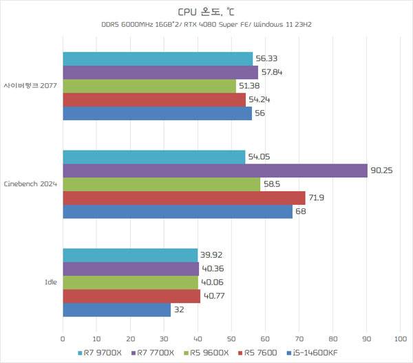 한편, CPU 온도는 AMD의 발표와 같이 라이젠 9000 시리즈에서 확실히 낮아진 것으로 나타났다. 라이젠 7 7700X는 최대 90℃에 달하는 온도를 기록한 반면 라이젠 7 9700X는 약 54℃ 36℃ 가까이 낮아졌다. 라이젠 5 9600X는 라이젠 5 7600과 비교해 약 13℃나 낮은 온도를 나타냈다.