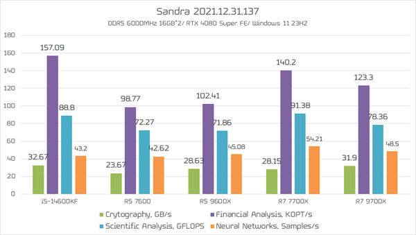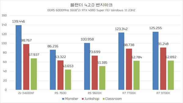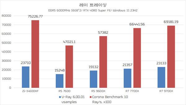 마지막으로 멀티 스레드/ 코어 활용도가 높은 레이 트레이싱과 블랜더, 산드라 벤치마크를 구동했다. 절대 코어가 가장 많은 코어 i5-14700KF가 상위권 점수를 유지하는 가운데, 동일한 TDP 스펙의 라이젠 5 9600X가 라이젠 5 7600보다 대체로 높은 점수를 기록해 Zen5 아키텍처의 전성비 개선 상황을 파악할 수 있으며, 이는 라이젠 7 7700X보다 낮은 TDP로 동급 성능을 발휘하는 라이젠 7 9700X의 결과로도 반추할 수 있다.