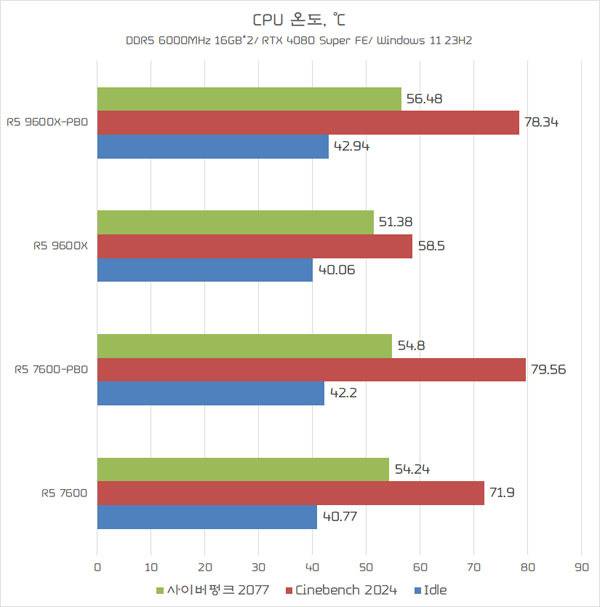 라이젠 7 9700X 같이, 라이젠 5 9600X도 정도는 낮지만 멀티 스레드 작업서 소비전력이 높아져 라이젠 5 7600보다 더 많은 전력을 소비하며, 온도는 라이젠 5 7600 PBO 상태와 유사한 수준으로 높아졌다. 라이젠 5 7600은 PBO 활성화시 소비전력이 약 10W, 온도는 8℃ 가량 높아졌다.