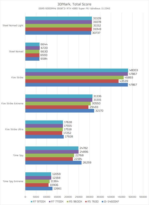 DX12 테스트인 타임 스파이 대체를 노리는 스틸 노마드의 경우 전체 테스트 CPU들이 거의 비슷한 수준으로 나타났다. 타임 스파이의 경우 라이젠 7 9700X와 라이젠 7 7700X는 거의 비슷한 결과를 보여주지만, 라이젠 5 9600X는 라이젠 5 7600보다 확실히 높은 성능을 발휘한다.
