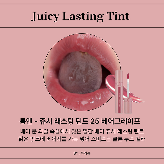 베어 문 과일 속살에서 찾은 말간 베어 쥬시 래스팅 틴트. 누디한 컬러감에도 요플레 현상없이 말갛게 유지되는 광택과 시간이 지날수록 더 탱글하게 차오르는 탕후루 광택. 베어그레이프 컬러는 맑은 핑크에 베이지를 가득 넣어 민낯에도 뜨지 않고 스며드는 쿨톤 누드 컬러야~